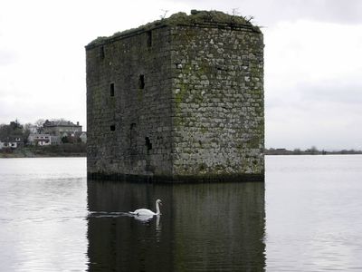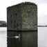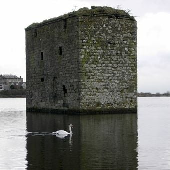 The castle structure emerges from the Stanely Reservoir waters, as the flooding of the surrounding marshland in 1837 submerged its lower portions.