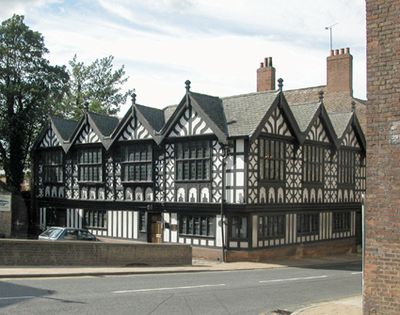 The timber-framed Stanley Palace stands three stories tall with ornate carvings, traditional leaded windows, and a prominent entrance facing Watergate Street.