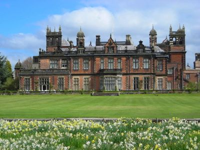 The main building features Jacobean style architecture with two lateral wings, constructed in brick with stone details and surrounded by gardens.