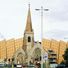 The church ruins remain accessible for viewing from Drake Circus area, with information panels detailing the structure's architectural and historical elements.