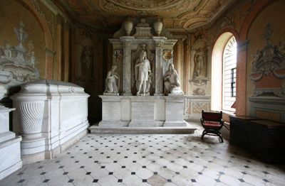 The west wall displays a sculptural monument by Grinling Gibbons showing the Duke in Roman attire with kneeling figures representing his wives.