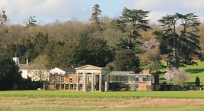 The Stratton Park estate features a stone portico designed by George Dance the Younger, surrounded by landscaped grounds and mature trees.