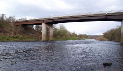Styford Bridge extends across the River Tyne with three concrete spans, carrying the A68 road east of Riding Mill through the Northumberland countryside.