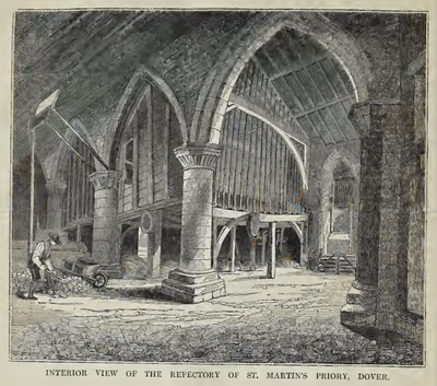 The stone remains of Dover Priory include segments of walls and architectural details from its original monastic structures near the town center.