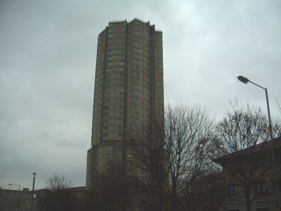 The concrete residential tower, designed by architect Owen Luder, features a rectangular shape rising 90 meters into the Gateshead skyline.