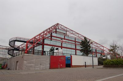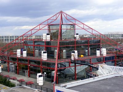 The structure's original design included red neon lights illuminating the apex, creating a notable landmark visible across Milton Keynes at night.