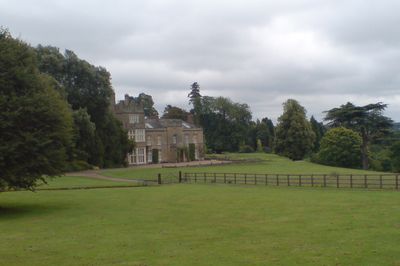 Titsey Place is an English country house with Georgian architecture situated on the North Downs in Surrey. The estate includes formal gardens, landscaped ponds, a walled kitchen garden, and surrounding parkland with mature trees.