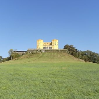 The Dower House stands on Purdown hill above the M32 motorway, featuring a yellow exterior and classical architectural elements with battlemented skylines.