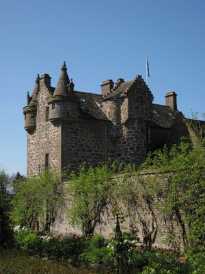 The stone tower house stands with multiple floors, featuring thick defensive walls and architectural details characteristic of 16th-century Scottish construction.