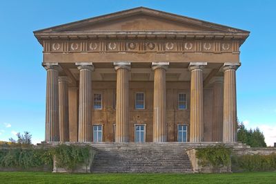 The Grange features white stone columns, a massive Doric portico, and symmetrical architecture that follows classical design principles of Ancient Greek temples.