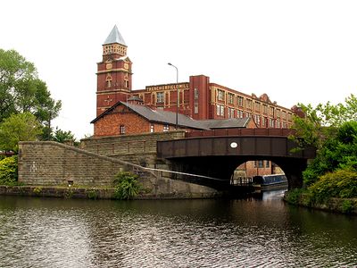The mill stands next to the Leeds and Liverpool Canal, featuring a substantial four-story brick structure with large windows and industrial architectural elements.