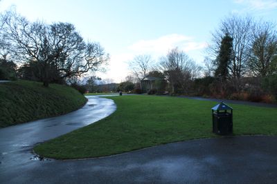 The gardens extend along tree-lined paths with maintained lawns, ornamental structures, and memorials near Exeter's city center walls.