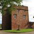 The stone tower features an L-shaped design with a rectangular main block, small stair wing, and distinctive corbelled parapet with rounded corners.