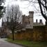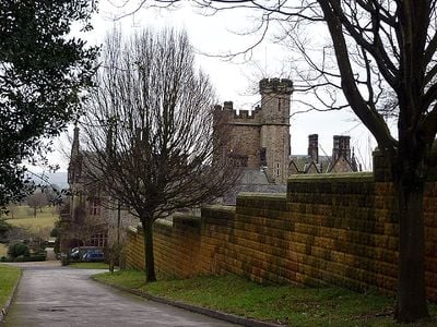 The sandstone structure features a battlemented tower with an octagonal corner turret and displays Jacobethan architectural elements throughout its exterior design.