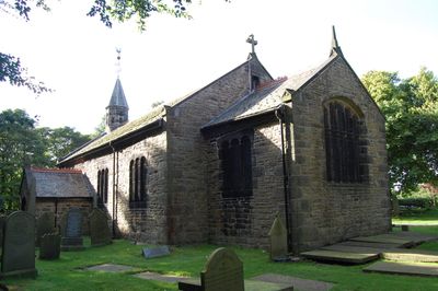 The sandstone building features three-light windows on both sides, large quoins, and a slate roof, with a nave measuring 55 feet in length.