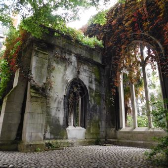 St Dunstan-in-the-East is a medieval church ruin that has been transformed into a public garden in the City of London district. The preserved gothic arches, walls and Christopher Wren steeple form the frame for beds of ferns, climbing plants and small trees.