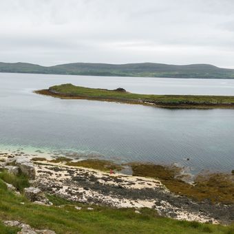 Two elevated land masses connected by a narrow isthmus form this uninhabited island in the northwest coastal waters of the Isle of Skye.