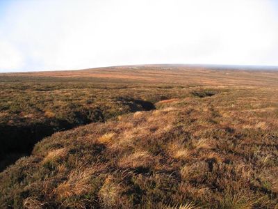 Peel Fell reaches an elevation of 602 meters with a cairn marking its peak and contains a flat boulder situated 7 meters southeast from the summit point.