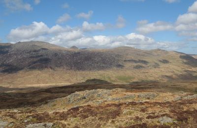 Y Foel Goch rises to 805 meters above sea level and features grassy terrain with scattered rock outcrops leading to a small cairn at its peak.