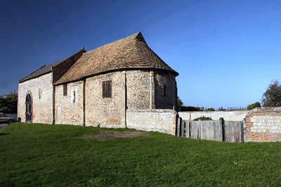 The Isleham Priory Church features chalk-rubble walls, a nave, chancel, and semi-circular apse, with original narrow slit windows and limestone arched doorways.