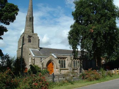 The gritstone structure includes a nave, chancel, southwest porch, and a west tower with spire, featuring diagonal buttresses throughout the exterior design.