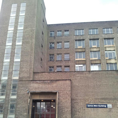 The James Weir Building stands as a ten-story structure with a prominent southeast corner tower, forming part of the University of Strathclyde campus.