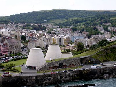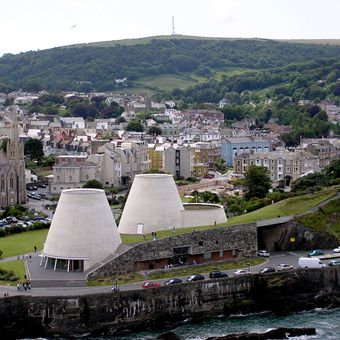 The Landmark Theatre stands with dual conical towers near the North Devon coast, offering a modern architectural addition to the Ilfracombe landscape.