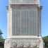 The structure displays military crests, female figures holding wreaths and medallions, and a laurel festoon frieze running along its top section.