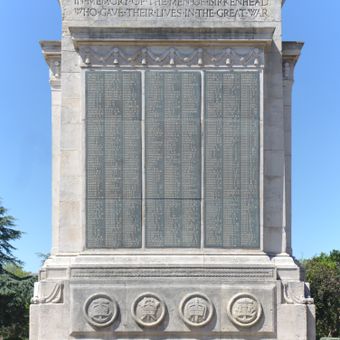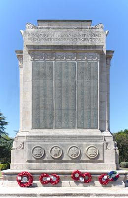 Names of World War I casualties appear on the longer sides of the memorial, while World War II fallen soldiers are listed on the shorter sides.