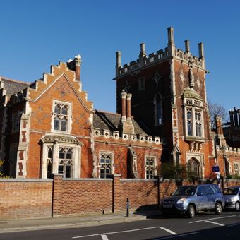 The Castle Club features Gothic Revival architecture with pointed arches, vertical lines, and detailed stonework across its exterior facade in Broomhouse Lane.