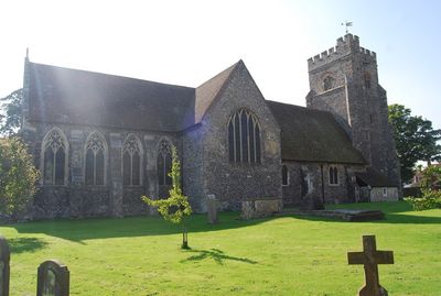 The Church of St Mary features Kentish knapped flint walls, ragstone elements, and a cruciform layout with nave, transepts, chancel, and tower.