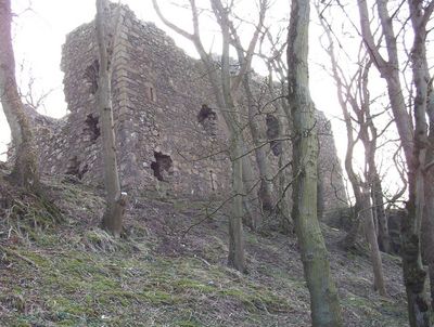 The ruins contain visible remnants of the vaulted ground floor and principal apartments, with archaeological features including two stone-built dykes across the moat.