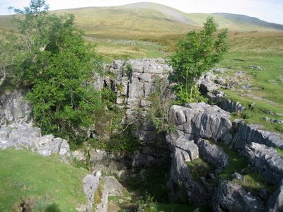 Bar Pot extends through two vertical shafts reaching a depth of 104 meters within the Carboniferous limestone formations of Ingleborough mountain.