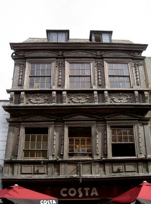The five-story timber-framed merchant's house at Southgate Street exhibits Jacobean architecture with detailed craftsmanship across its exterior and interior spaces.
