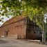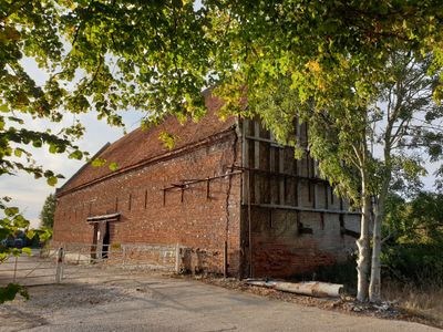 The red brick barn spans seven bays with a steep roof, standing near the Thames at the western section of The Warren in Caversham.