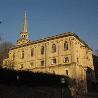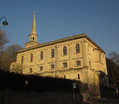 The building remains the sole 18th-century parish church in Bath, featuring gates with rusticated base panels and decorative inverted torches.