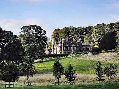 Cell Park is a brick country house with corner towers and connected service buildings arranged around an enclosed courtyard. The 79-acre grounds include formal gardens, maintained pathways, and open green spaces spread across the entire property.