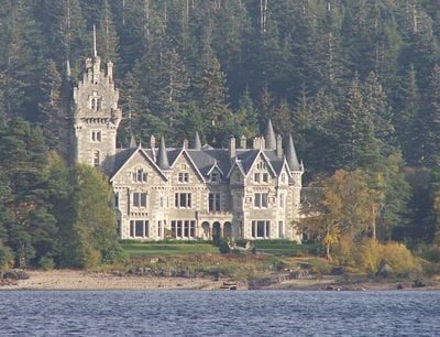 The Scottish Baronial mansion features towers, turrets, and granite walls, standing near Loch Laggan against the backdrop of the Grampian Mountains.