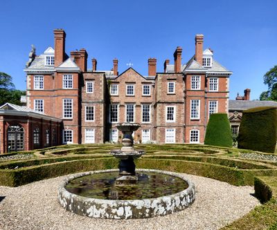 The three-story brick mansion displays terracotta details, slate roofs, and nine-bay side elevations arranged in a symmetrical layout overlooking a parterre garden.
