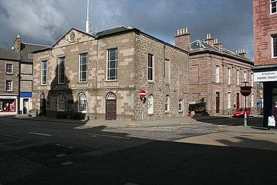 Located at The Cross intersection with coordinates 56.6444° N and 2.88848° W, the Category B listed building serves as a meeting place for Angus Council.