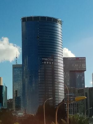The building anchors the city's business district and defines the skyline with its contemporary design language. Its curved form stands apart from surrounding structures and makes a visual statement about modern Israeli commerce.