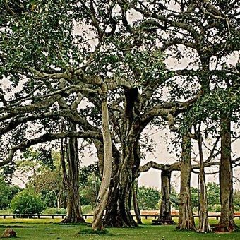 The banyan tree spreads its canopy across 19,107 square meters with numerous aerial roots extending downward from branches to form additional trunks.
