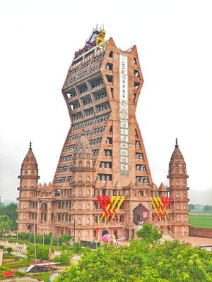 The temple stands 317 feet tall with four symmetrical corner towers, incorporating both Sultanate and Mughal architectural elements in its design.