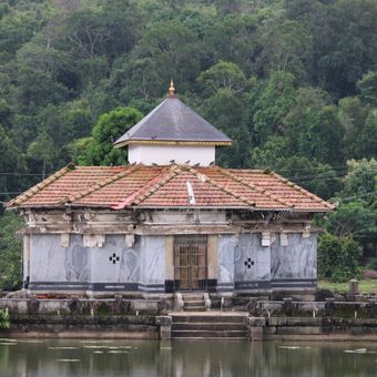 Kere Basadi is a Jain temple standing on an island in a lake dotted with water lilies. The structure features four identical facades and can only be accessed by boat from Varanga village.