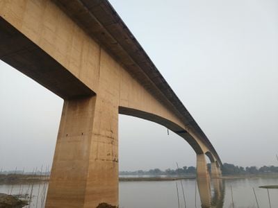 The Gouranga Bridge spans 588 meters across the Bhagirathi River, connecting the cities of Nabadwip and Krishnanagar in West Bengal.