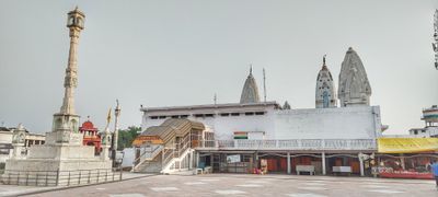 The Ahichchhatra temple compound features multiple structures with detailed marble carvings, statues, and seven ceremonial platforms across its grounds.
