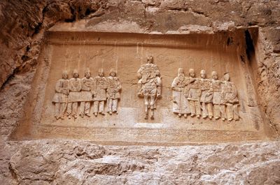 The stone relief extends 8 meters in width and 4 meters in height, featuring Naser al-Din Shah on horseback with ten ministers standing beside him.