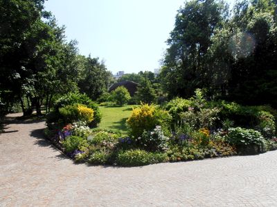 The estate includes a 14,000 square meter garden with numerous flowering plants, pathways, and recreational areas for public enjoyment.