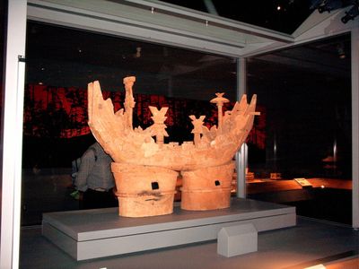 The mound contains numerous haniwa, terracotta clay figures depicting humans, animals, and buildings, which provide information about ancient Japanese funeral practices.