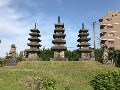 Three stone pagodas stand on a hill, accompanied by four guardian statues representing the Four Heavenly Kings at the ancient Hayatozuka site.